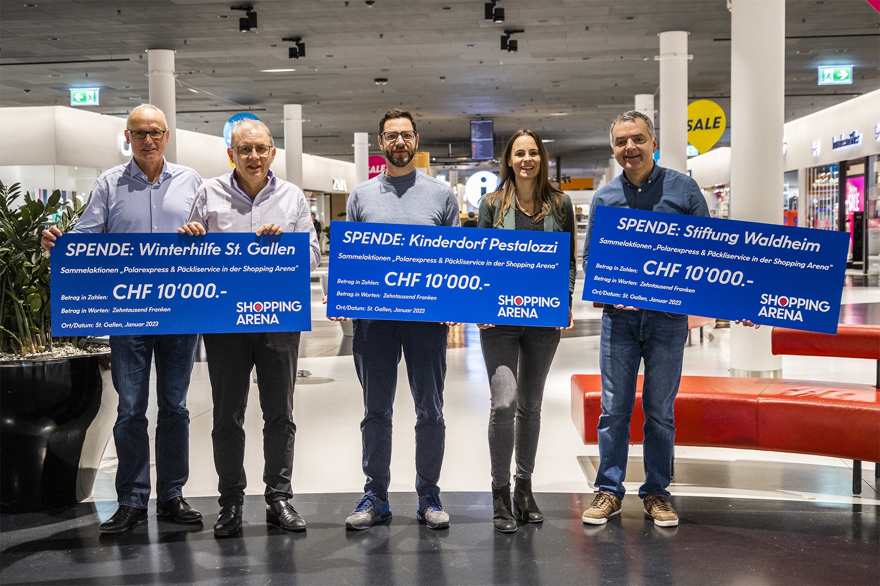 Während der Adventszeit wurde in der Shopping Arena St. Gallen eine Spendenaktion zuguns-ten der Winterhilfe St. Gallen, der Stiftung Kinderdorf Pestalozzi sowie der Stiftung Waldheim durchgeführt. Dabei sind 30‘000.- Franken zusammengekommen. Gestern Mittwoch, 11. Januar 2023, fand die Checkübergabe statt.
